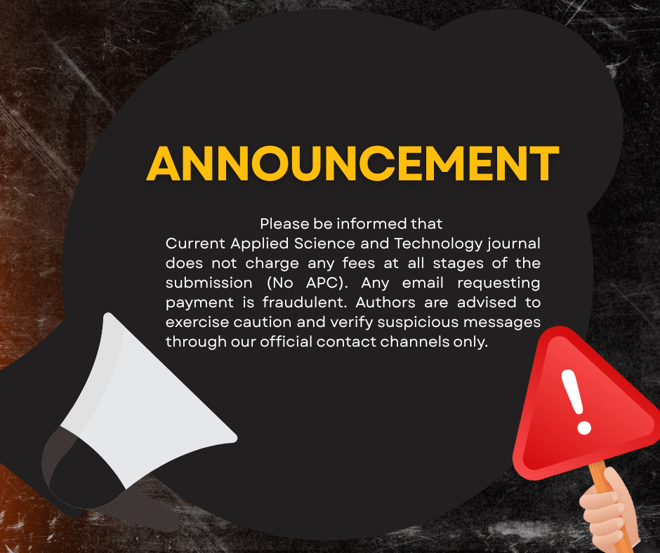 Please be informed that Current Applied Science and Technology journal does not charge any fees at all stages of the submission (No APC). Any email requesting payment is fraudulent. Authors are advised to exercise caution and verify suspicious messages through our official contact channels only.